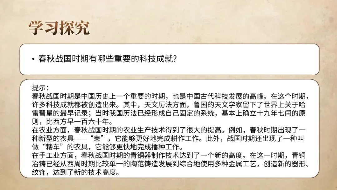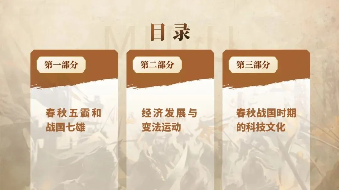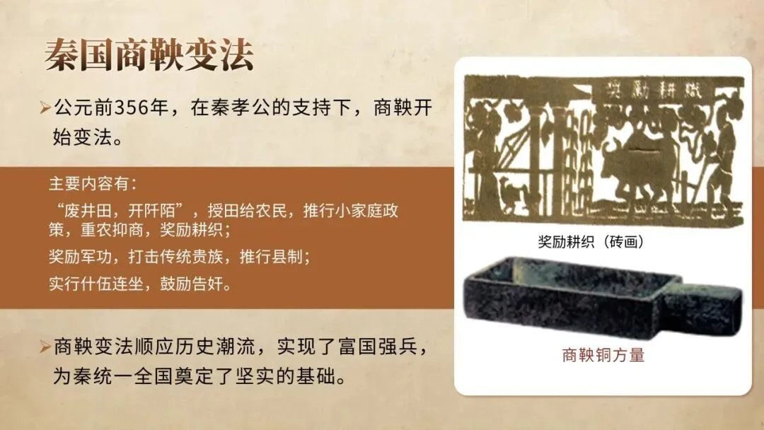 本课讲述春秋战国550余年巨变:铁器牛耕普及,井田制瓦解,私田与地主经济兴起;周王室衰微,诸侯争霸兼并,分封、宗法松动,士阶层崛起。百家争鸣,儒、墨、道、法诸家竞起,奠定中华文化底色。战国七雄变法,商鞅废井田、奖军功、行县制,中央集权雏形出现,为秦统一奠基。