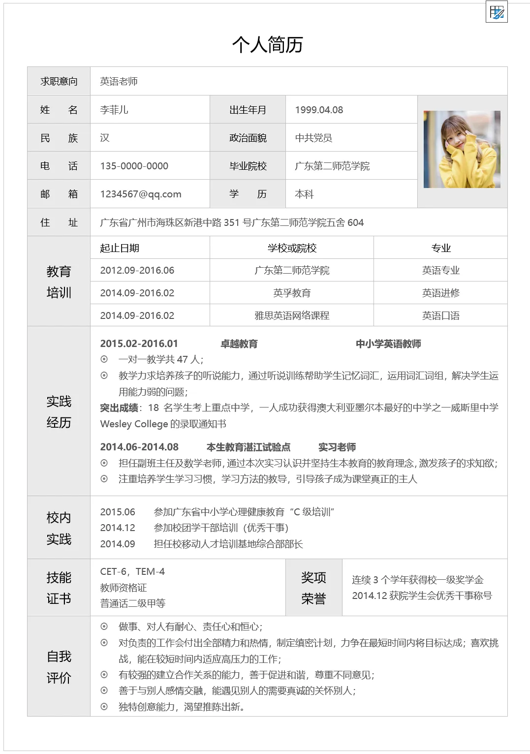 英语老师个人简历表格电子版,WORD文档电子版,可免费下载打印