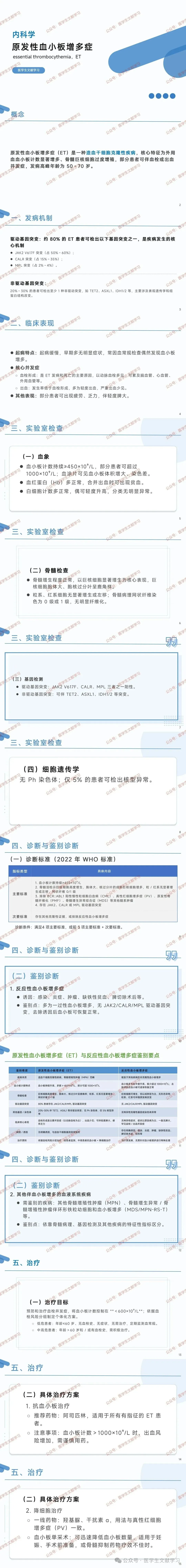 - 鉴别点:血小板多为一过性轻中度升高,无驱动基因突变,去除诱因后可恢复正常。