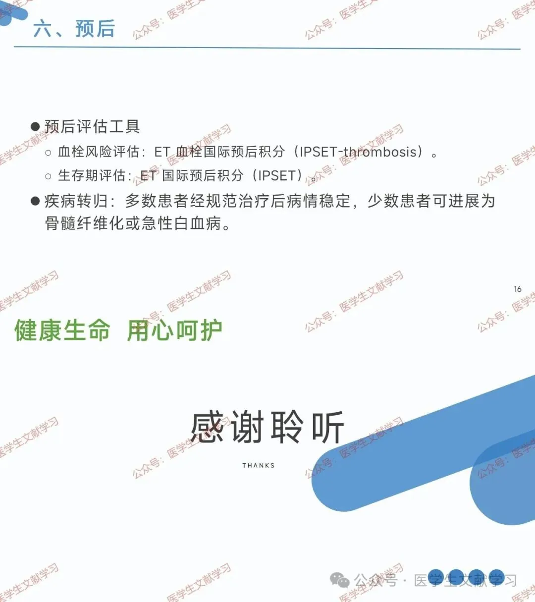 - 预后评估:采用 ET 血栓国际预后积分(IPSET-thrombosis)和生存期积分(IPSET)。