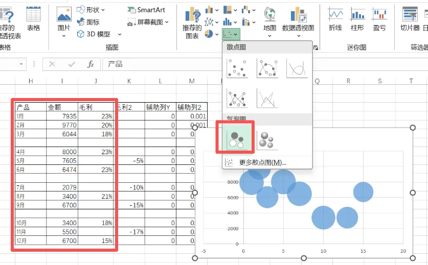 第二步、选中产品,金额、毛利三列,插入气泡图