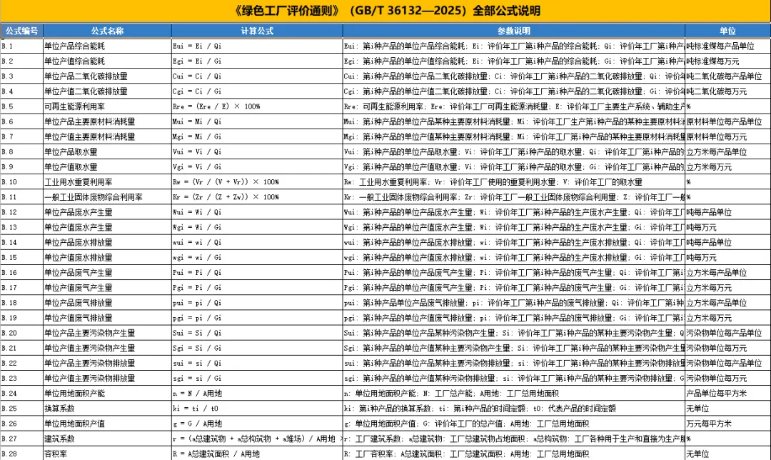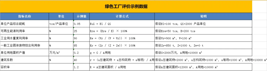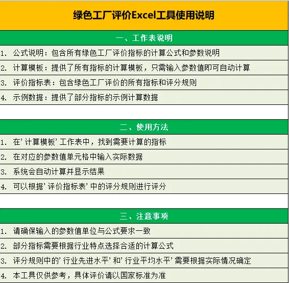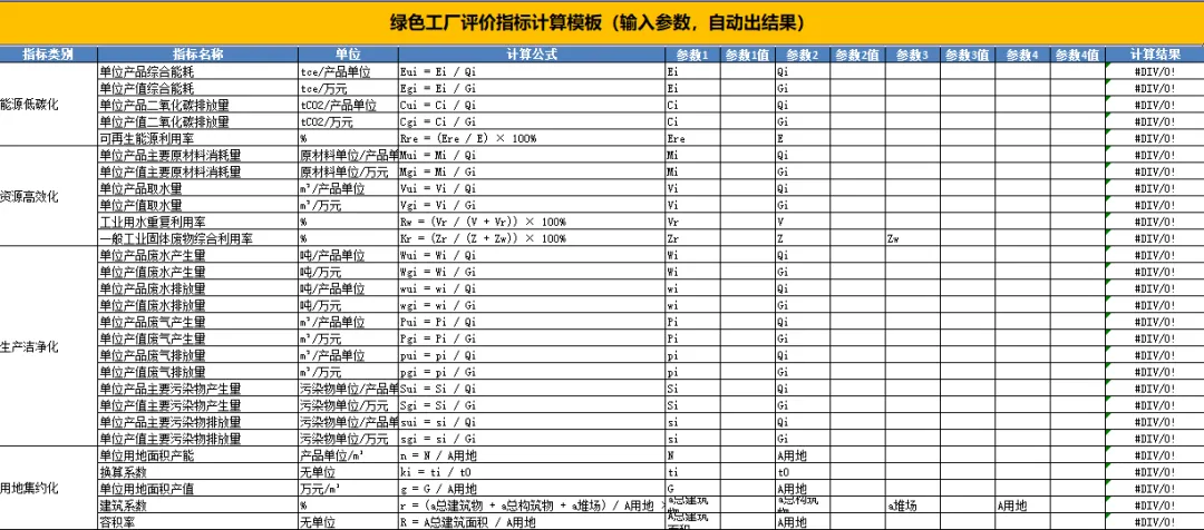 最新版的《绿色工厂评价通则》中有大量公式,为帮助大家快速上手使用,根据通则制作了一份Excel自动计算表:
