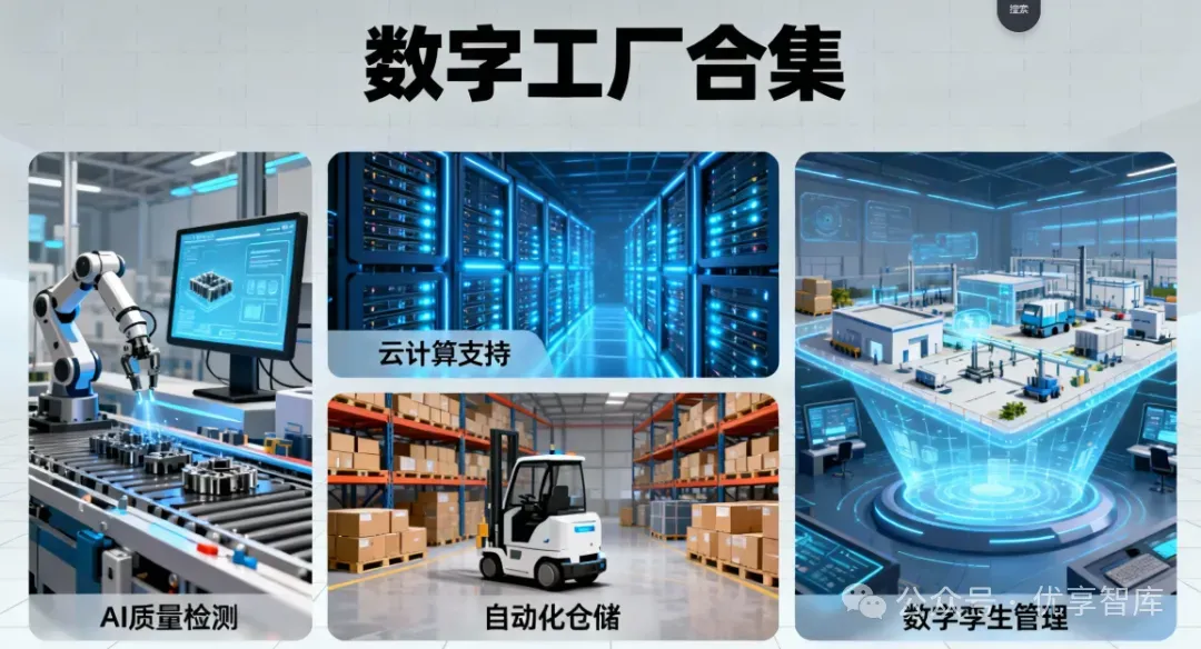 智能工厂: 终极物理形态与实践目标。指应用上述所有技术,实现生产流程自动化、柔性化、透明化、智能化,并能快速响应市场变化的现代化工厂。它是工业互联网和各类系统在物理工厂的落地体现。
