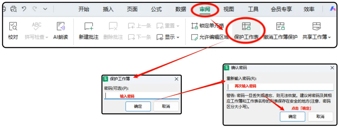 ① 在顶部菜单栏找到「审阅」--->点击「保护工作表」进入选项菜单栏;