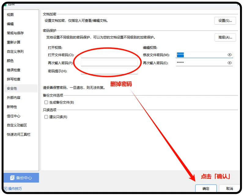 直接把之前设置的密码删除掉,点击「确定」即可。操作路径和上面设置密码保护的路径一样。