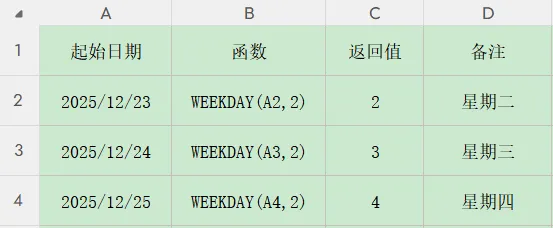 支持自定义星期起始日(如中国习惯把周一作为每周第1天、国外把周日作为每周第1天),是日期分析、排班表制作、工作日计算等场景的常用函数。