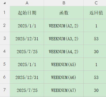 函数支持自定义星期起始日,是周度报表制作、数据按周汇总重要工具。