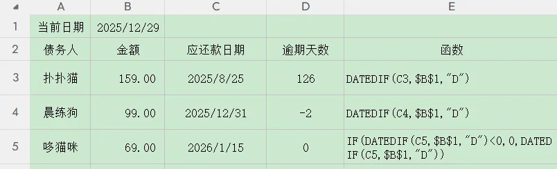用TODAY+DATEDIF组合,可以实现灵活的获取指定日期和当前日期的日期差,用来计算逾期天数最为合适。