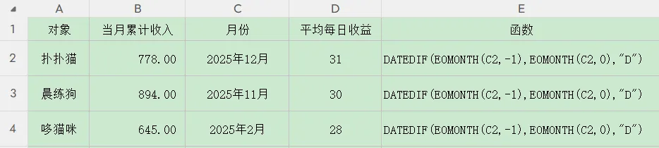 要计算当月每日收益,就得计算出当月有多少天,就得知道每月最后一天是哪一天,此时就需要使用EOMONTH函数。