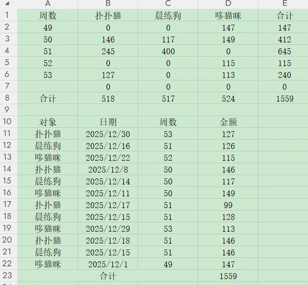第三步:通过SUMIFS就周数和对象两个条件进行汇总运算。