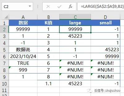 3)对于第二个参数K值,如果k≤0,或超过数组元素个数时,函数返回#NUM!数字错误;如果k值为小数,large函数做向上取整,small函数做向下取整。