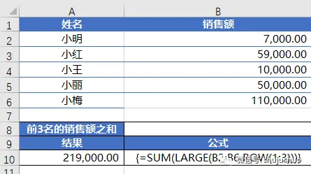 利用large函数,可以动态实时快速地统计出公司前3名的销售额之和。B10单元格公式“{=SUM(LARGE(B2:B6,ROW(1:3)))}”,公式的核心思路在于对k值的处理,使用row函数返回数组{1,2,3},返回前三名销售额的内存数组,最后用sum函数对数组值求和,当然也可以换成average函数计算平均值。
