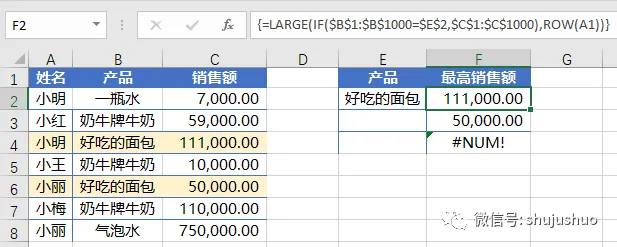 示例为指定条件计算最高销售额记录,F2单元格公式“{=LARGE(IF($B$1:$B$1000=$E$2,$C$1:$C$1000),ROW(A1))}”,这次是要数组和K值双向努力,if函数构建一个由“好吃的面包”销售额和逻辑值False构成的内存数组;row(a1)的目的是构建一个1,2,3...序列递增的动态k值,F2显示最大的销售额,F3显示第二大的销售额,F4显示第三大的销售额,但因为只有两条记录,所以返回#NUM!数字错误.