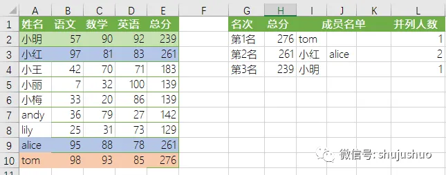 L2:L4显示是否有并列名次,L2单元格公式“=COUNTIF($E$2:$E$10,H2)”,1表示没有并列名次,2表示有2个并列名次,要是人数超过3,说明需要把成员名单列数进行扩充。