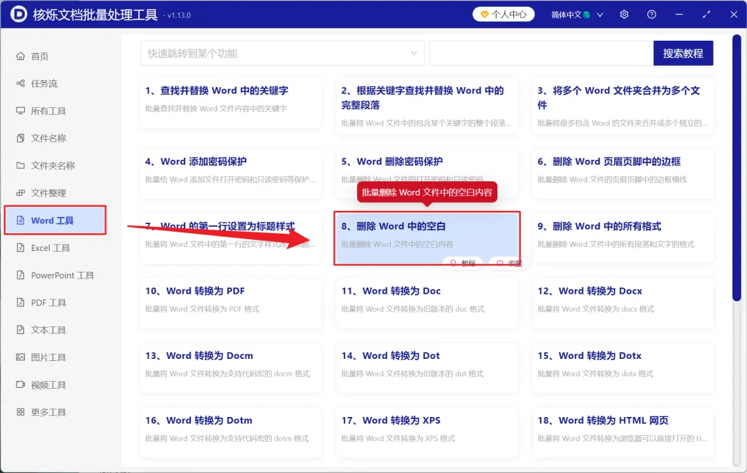 1、打开【核烁文档批量处理工具】,选择【Word 工具】-【删除 Word 中的空白】。