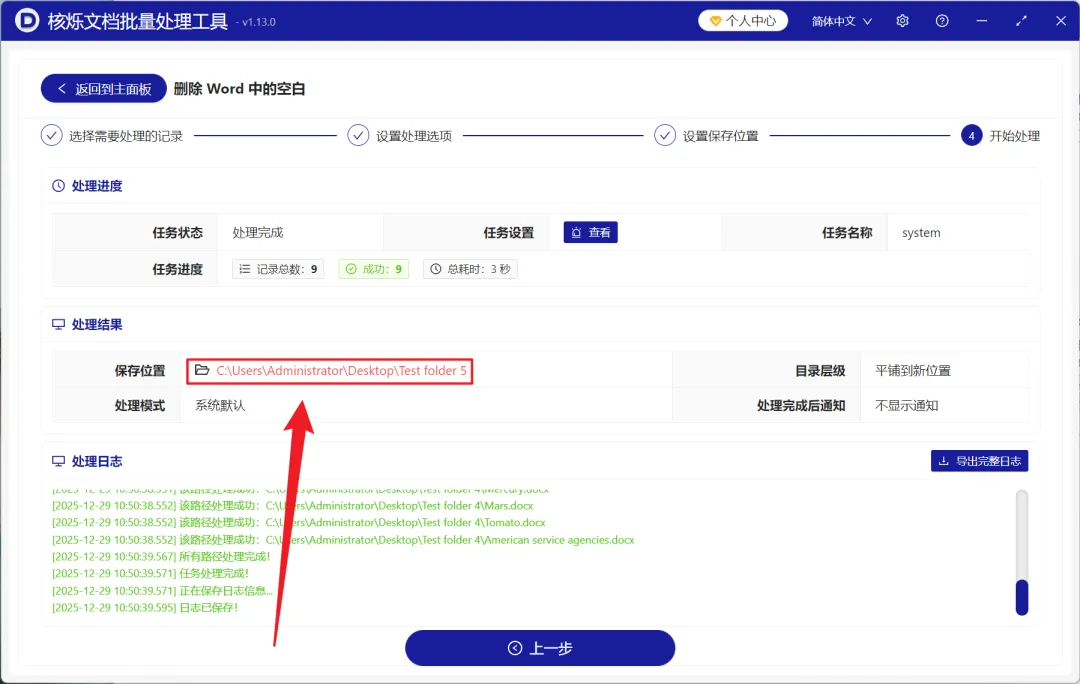 4、等待处理结束之后,点击红色的路径打开文件夹,所有 Word 文件中的空白行都全部删除了。