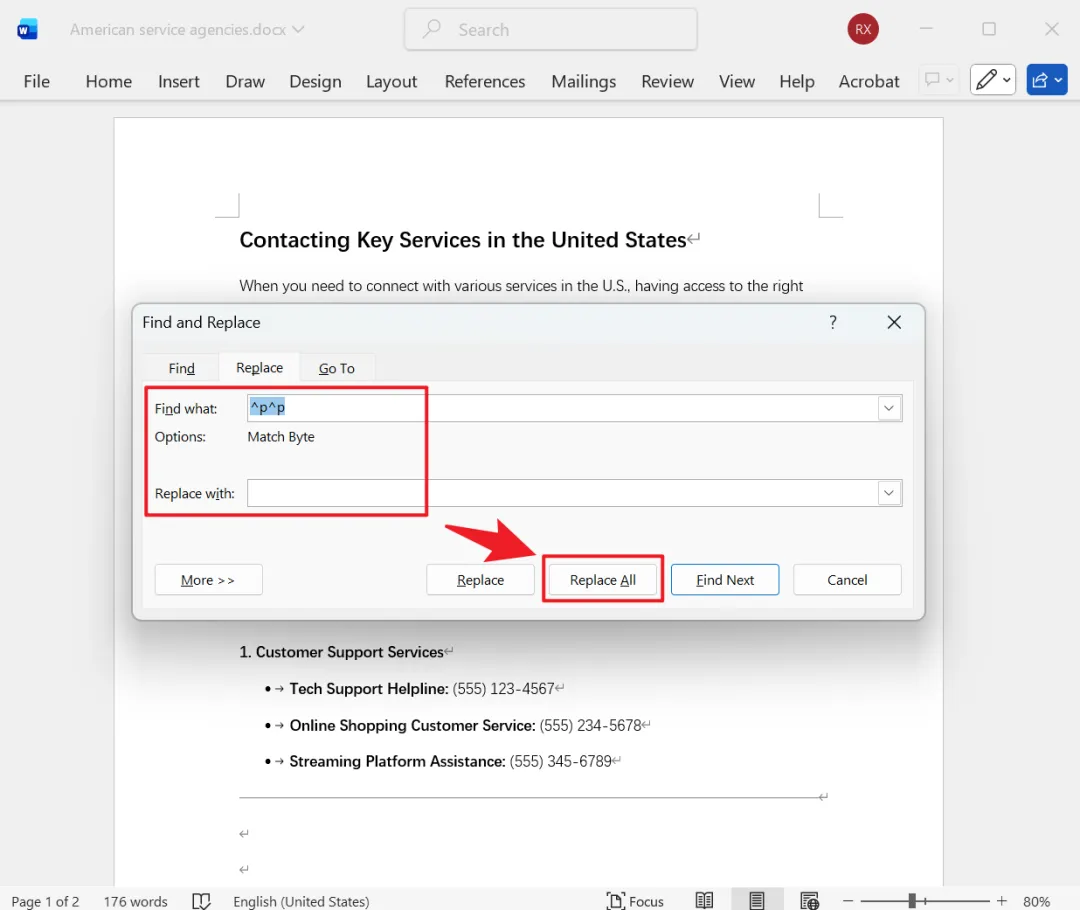 方法二:使用 Word 内置的查找替换功能快速删除文中所有空白行