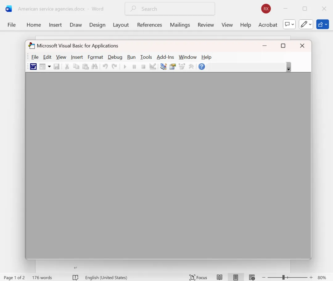 1、打开 Word 文件,按下 Alt + F11 打开 VBA 编辑器。