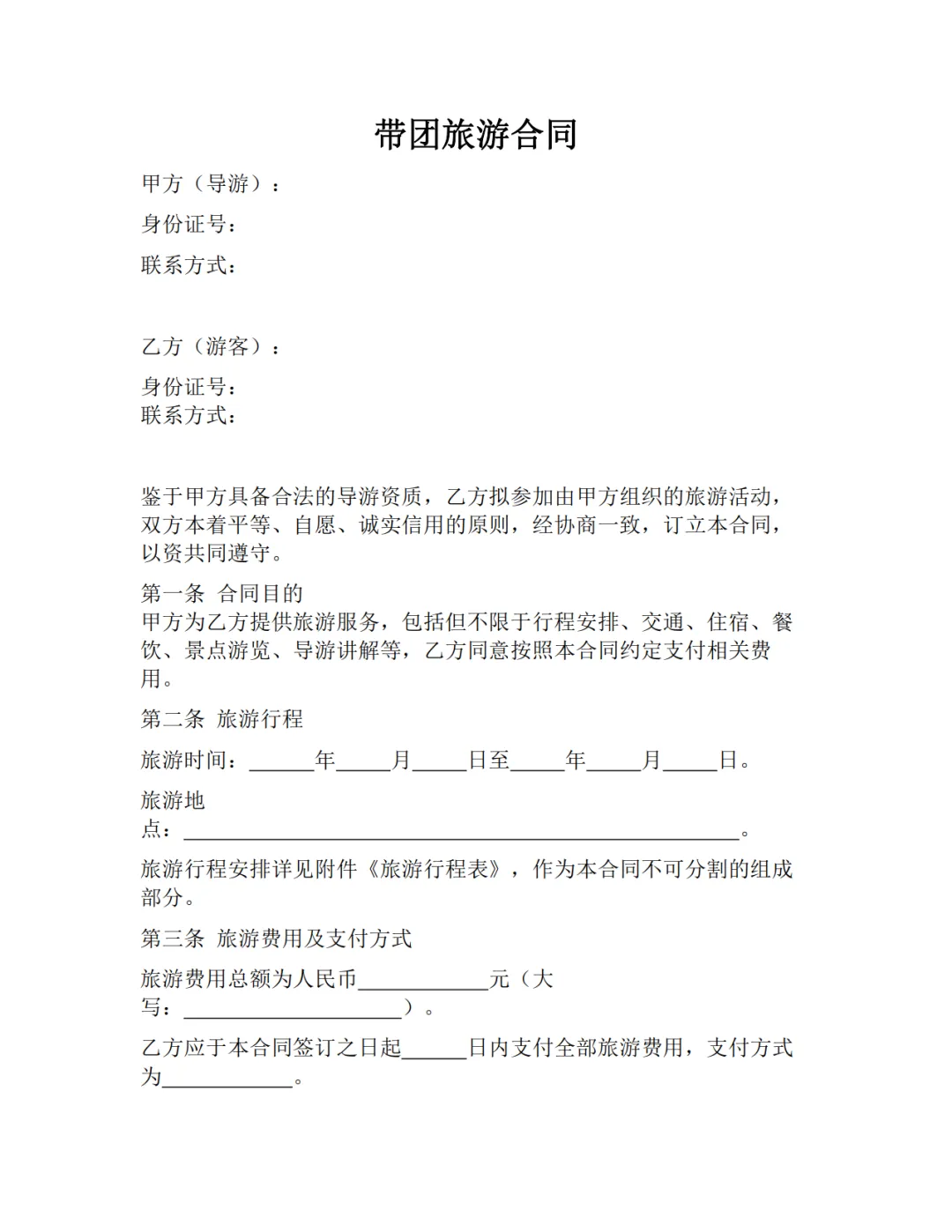 >带团旅游合同范本,WORD文档电子版,可免费下载打印