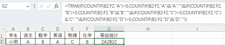 =TRIM(IF(COUNTIF(B2:F2,"A")>0,COUNTIF(B2:F2,"A")&"A","")&IF(COUNTIF(B2:F2,"B")>0,COUNTIF(B2:F2,"B")&"B","")&IF(COUNTIF(B2:F2,"C")>0,COUNTIF(B2:F2,"C")&"C","")&IF(COUNTIF(B2:F2,"D")>0,COUNTIF(B2:F2,"D")&"D",""))这个公式会自动跳过数量为0的等级。比如小明没有D等级,结果会显示“2A 2B 1C”,更加简洁(如下图)。 处理全班数据时,只需将公式向下拖动即可应用到所有学生。