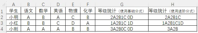 使用基础公式会显示所有等级包括0值;使用进阶公式则更加简洁,只显示实际获得的等级。 问:如果除了ABCD,我们还有E等级怎么办?