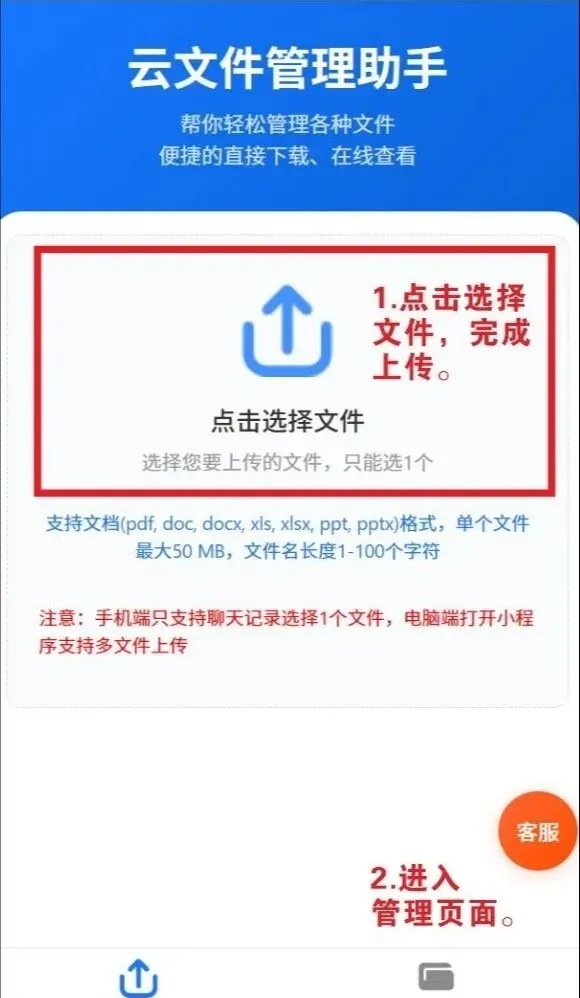 支持Word、Excel、PDF、PPT等常见办公格式,单文件最大支持50MB,日常运营完全够用,电脑端还能批量上传,效率更高。