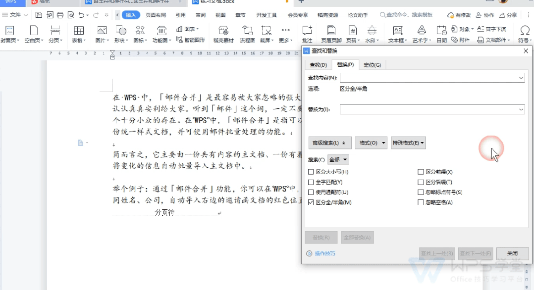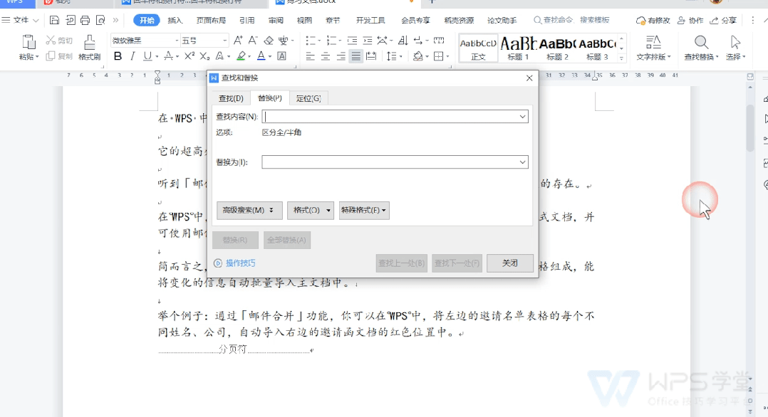 若想删除由「回车符」导致的文本空段,单击「开始」选项卡-「查找替换」(快捷键Ctrl+H)。