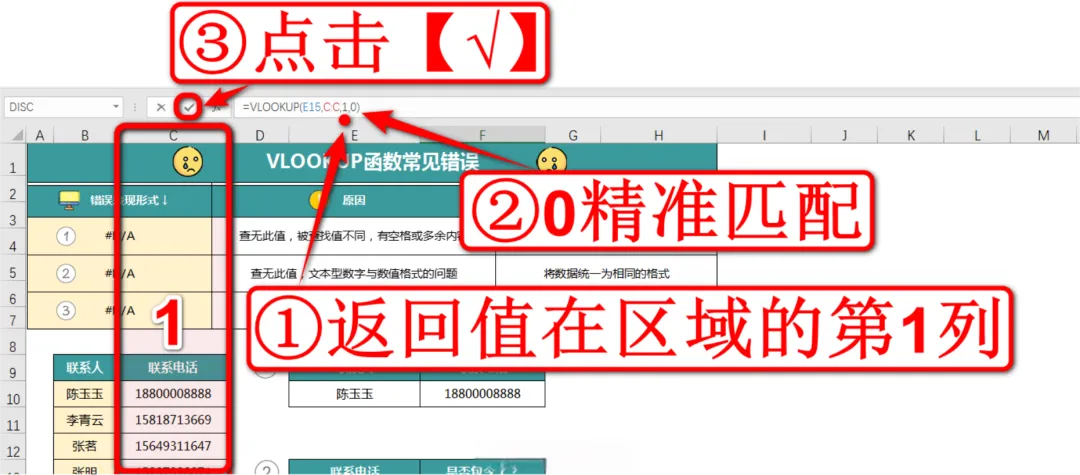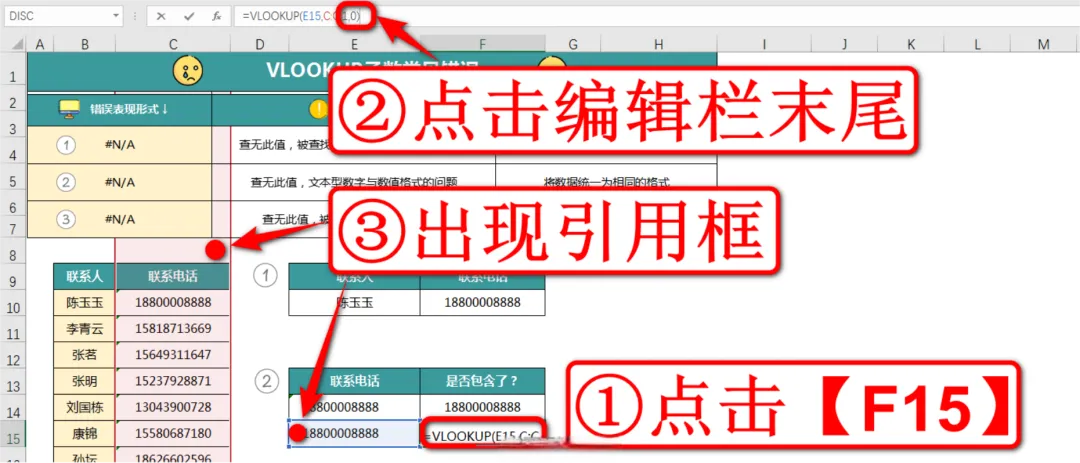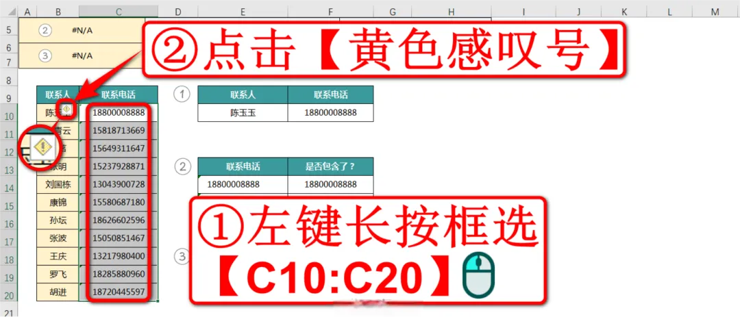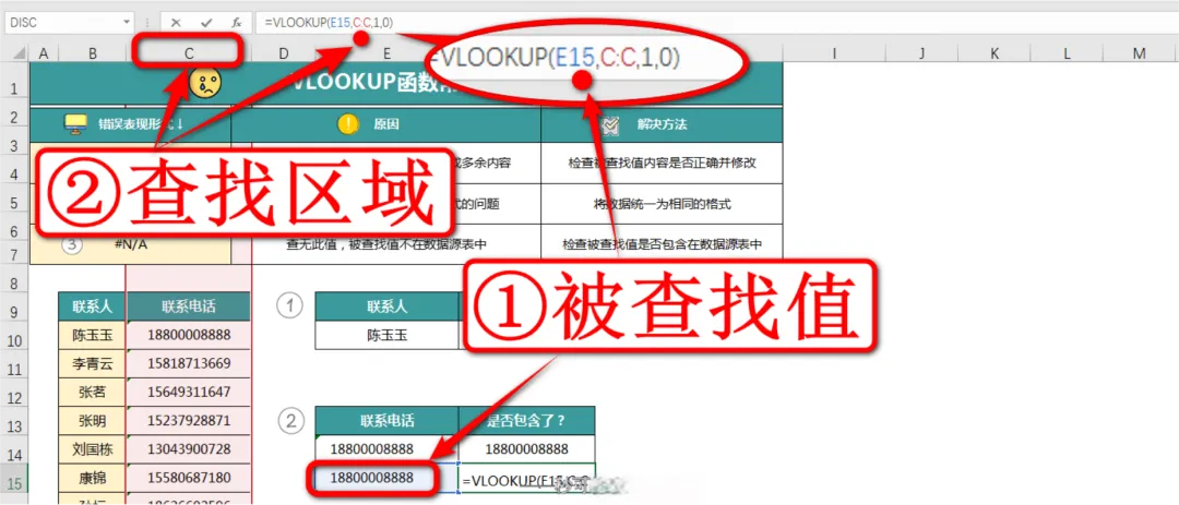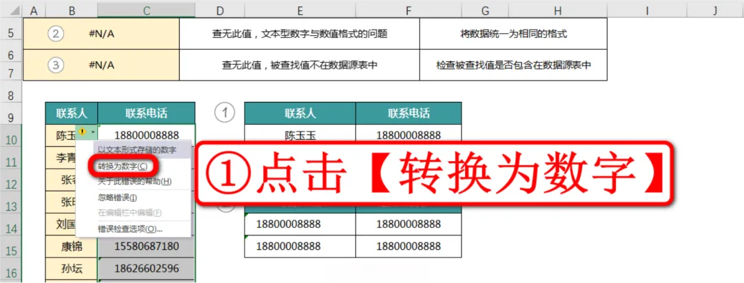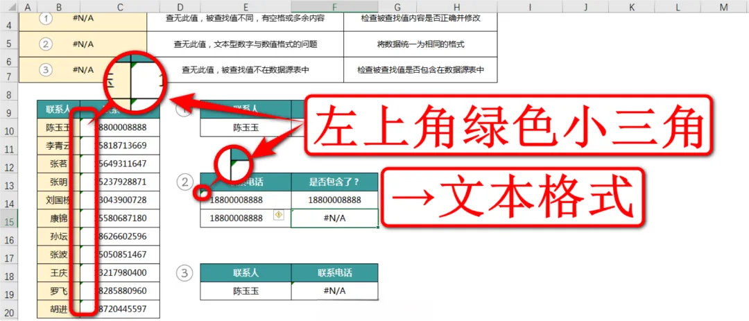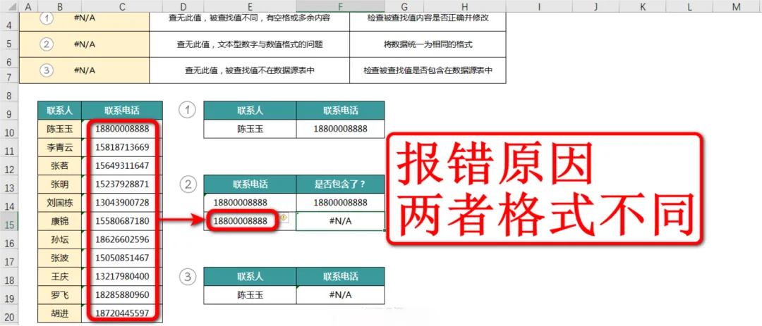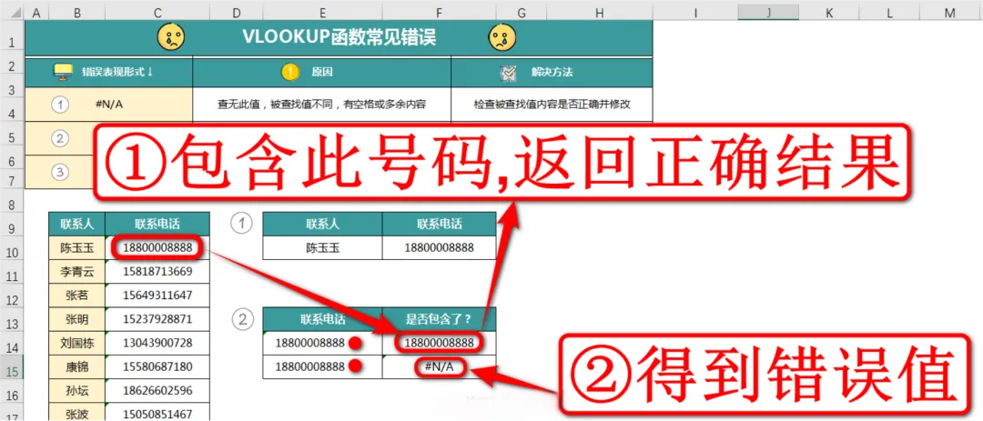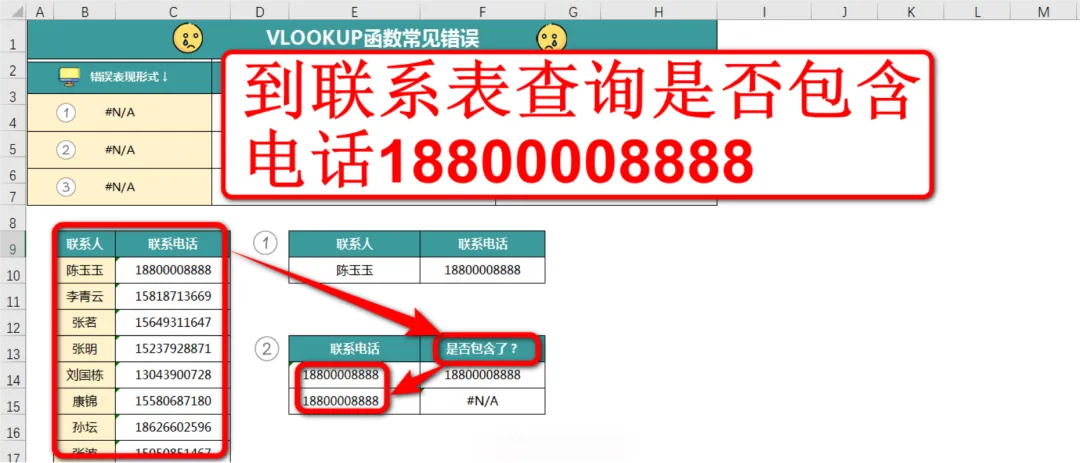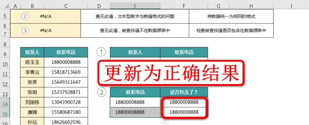 接着我们来纠正第二个错误案例,这个案例是要查找18800008888的联系电话是否包含左侧联系表的C列中,如下图: