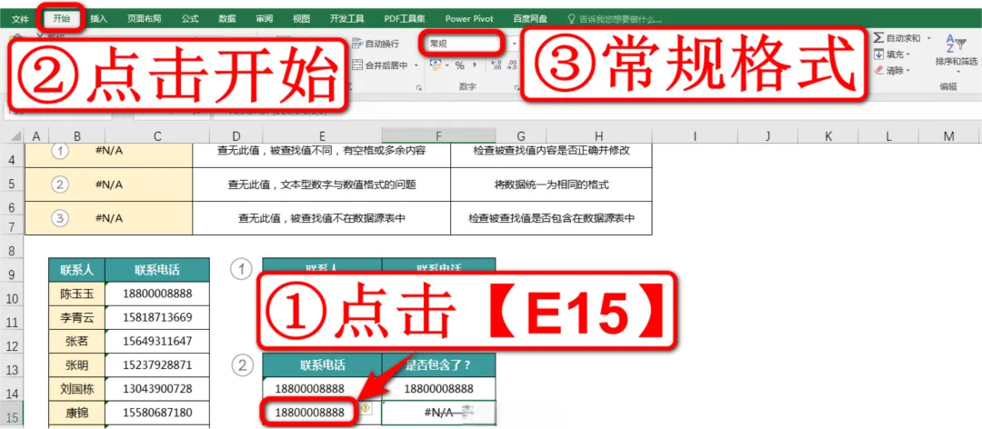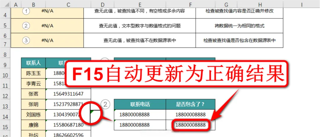 此时你可以看到F14单元格返回了正确的手机号码,而联系表中也对应有这个电话号码,查找的号码是相同的,但是F15单元格却返回了#N/A错误,如下图: