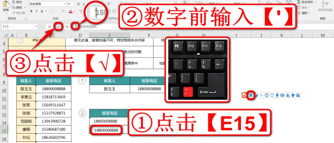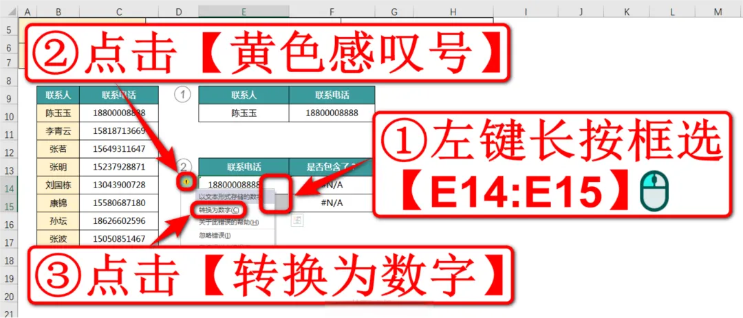 此时E15单元格就更改为文字格式了,单元格左上角也出现了绿色的小三角,F15单元格也自动更新为正确的联系电话,如下图:
