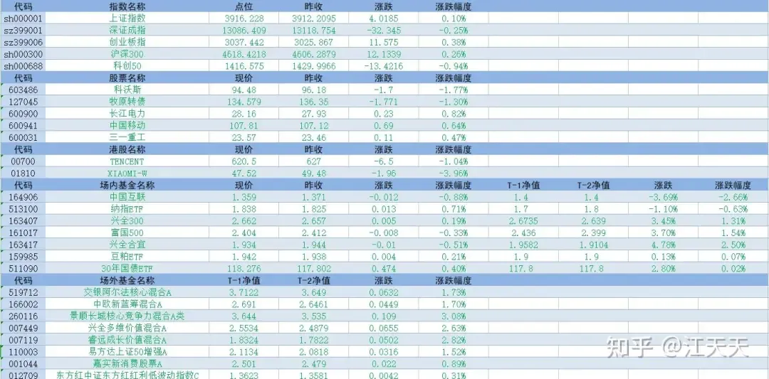 如下图,只需提供首列代码,后面的绿色内容都是公式生成的。你可以在其他任何需要的单元格使用相关函数,以获取股票的名称、价格、最高价、最低价、成交量、成交额等信息。