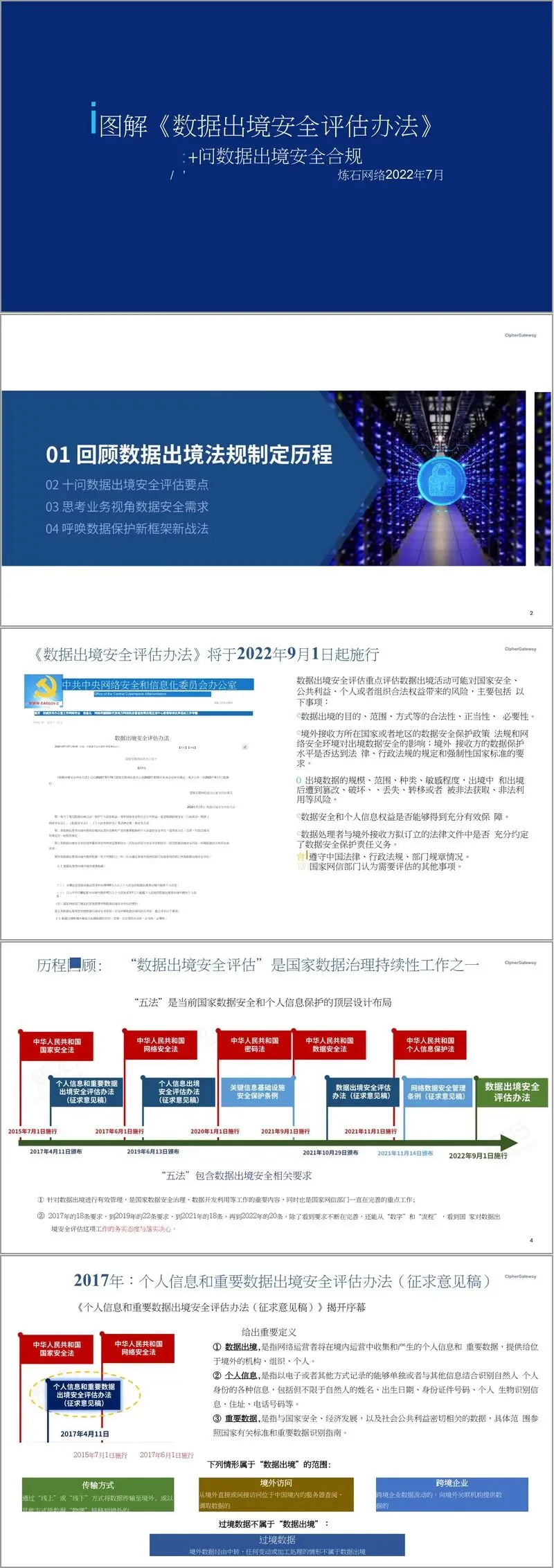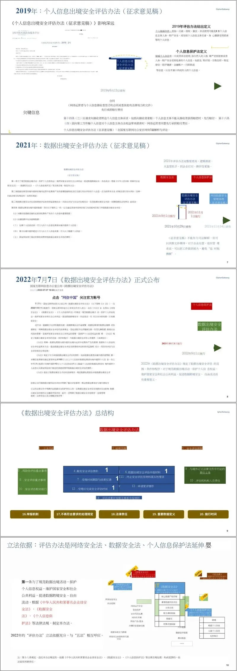 资料首先回顾数据出境法规制定历程,指出 “数据出境安全评估” 是国家数据治理的持续性工作,“五法”(《网络安全法》《密码法》《个人信息保护法》《国家安全法》《数据安全法》)构成当前国家数据安全和个人信息保护的顶层设计,且均包含数据出境安全相关要求。从 2017 年《个人信息和重要数据出境安全评估办法(征求意见稿)》给出重要定义、明确 “数据出境” 范围,到 2019 年《个人信息出境安全评估办法(征求意见稿)》界定个人敏感信息并强调合同中先行承担赔付责任,再到 2021 年数据出境安全评估办法(征求意见稿)提升完整度与操作性,直至 2022 年 7 月 7 日《数据出境安全评估办法》正式公布,自 2022 年 9 月 1 日起施行,法规不断完善,体现国家务实态度与落实决心。