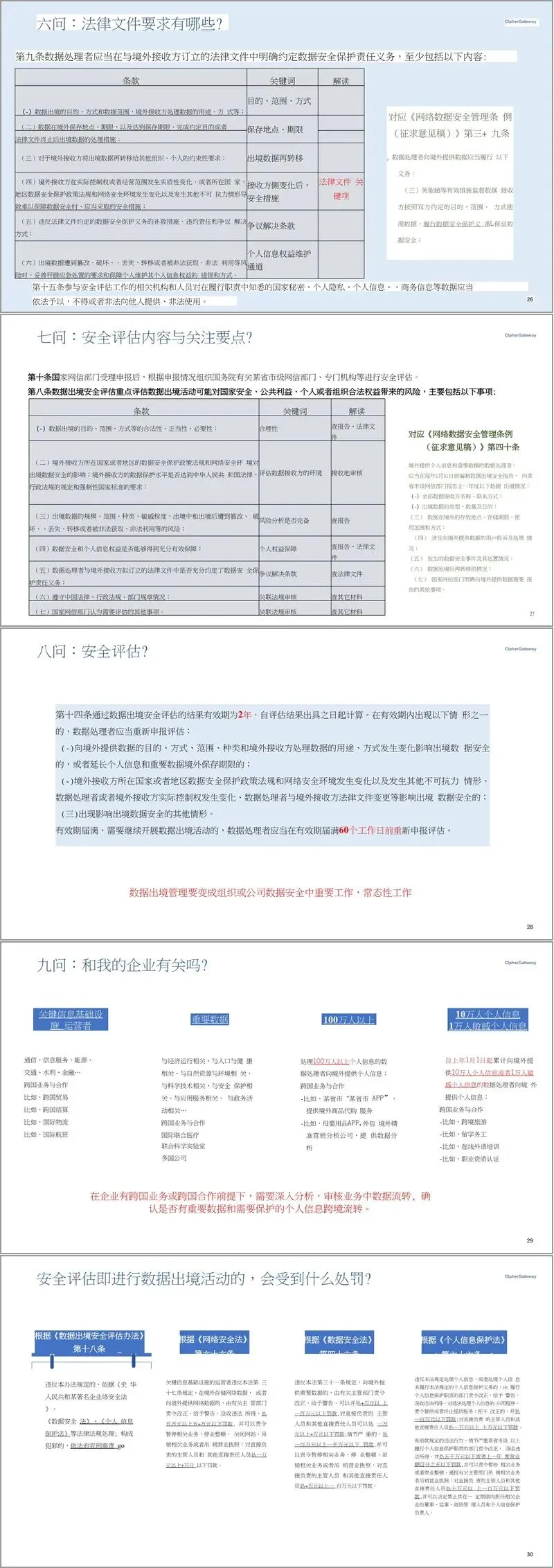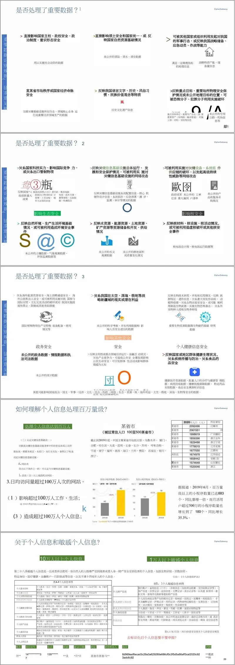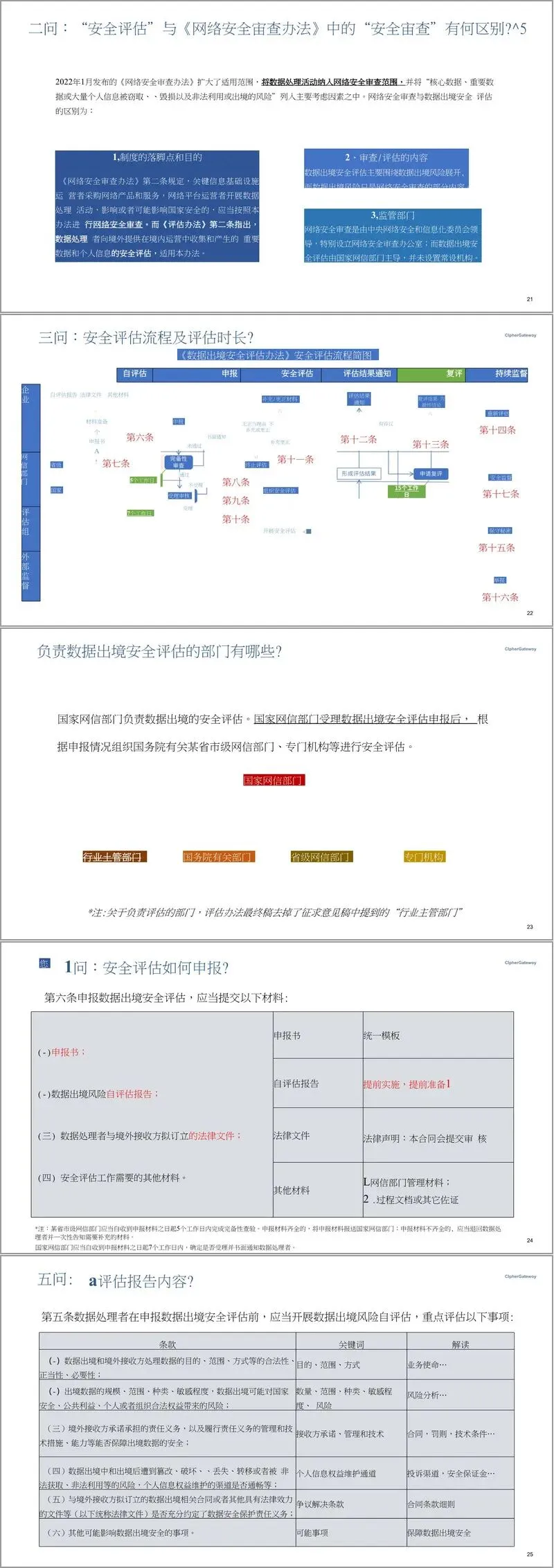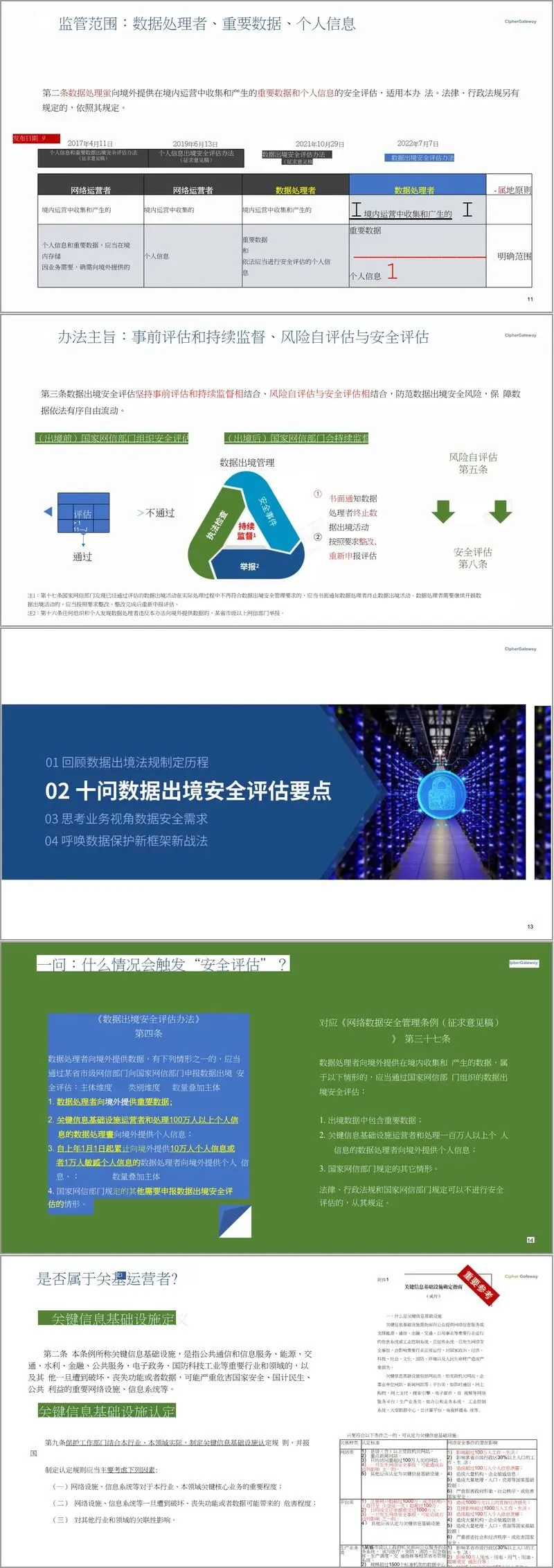随后,资料以 “十问” 形式深入解析数据出境安全评估要点。一问明确触发 “安全评估” 的四类情形,包括提供重要数据、特定主体提供个人信息达到一定规模等;二问对比 “安全评估” 与《网络安全审查办法》中“安全审查” 在制度目的、内容、监管部门的差异;三问梳理安全评估流程,涵盖材料准备、申报、受理审核、组织评估、结果通知及复评等环节,并明确各阶段时限;四问到十问则分别详解申报材料、自评估报告内容、法律文件要求、安全评估内容与关注要点、评估结果有效期与重新申报情形、企业适用情况及违法处罚,以及企业从管理、技术、实战、法律文件、用户角度的应对举措。