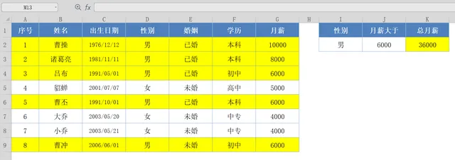 SUMIFS为多条件求和函数;通过判断【性别】和【月薪】2个条件;计算出【性别】为:男性,【月薪】大于6000的工资总和;