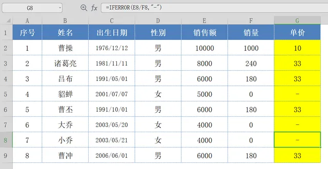 因为被除数不能为0 ,当【销量】为0时会报错,我们可以使用IFERROR函数,将报错信息转换为横杠;