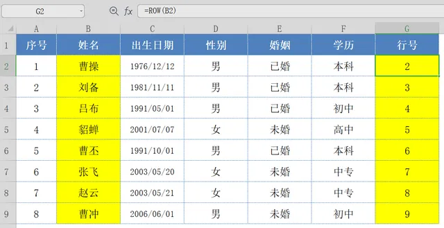 ROW函数:=ROW(B2)