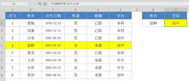 VLOOKUP函数,可以在表格区域内,查找指定内容;通过【姓名】列的:貂蝉,可以定位到相关【学历】列的:高中;