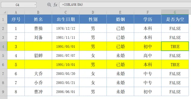 ISBLANK函数,用于判断指定的单元格是否为空;如果【姓名】列为空,ISBLANK函数会返回:TRUE;否则会返回:FALSE;