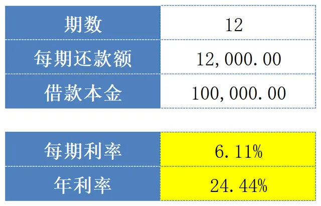 RATE为利率函数,假定借款10万元,约定每季度还款1.2万元,共计3年还清,使用RATE函数,可以计算出年利率为:24.44%;