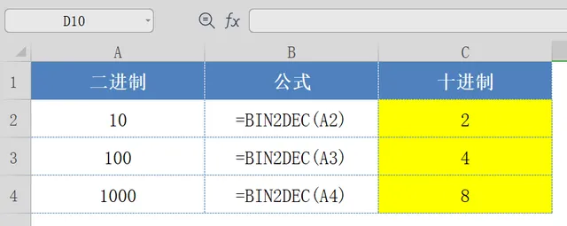 BIN2DEC函数,可以将二进制转换成十进制;利用BIN2DEC函数,可以将二进制10,100,1000;转换成十进制:2,4,8;