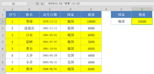 我们先选中H2单元格,并在编辑栏输入函数公式:=DSUM();然后输入函数第1个参数:用鼠标选中A1:E9单元格区域;第2个参数:“销量”;第3个参数:用鼠标选中G1:G2单元格区域;最后按回车键结束确认,即可计算出:魏国所有销售人员的销量;