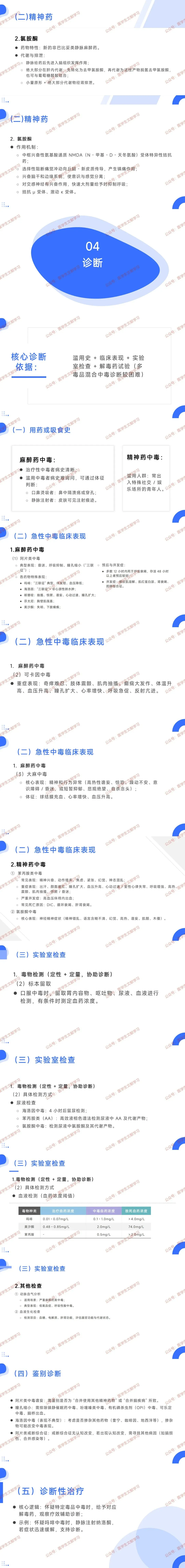 - 精神药中毒:苯丙胺类常见精神兴奋、幻觉,重症有高热、心律失常、惊厥等,可并发颅内出血;氯胺酮核心为神经精神症状(错乱、幻觉、谵妄等)。