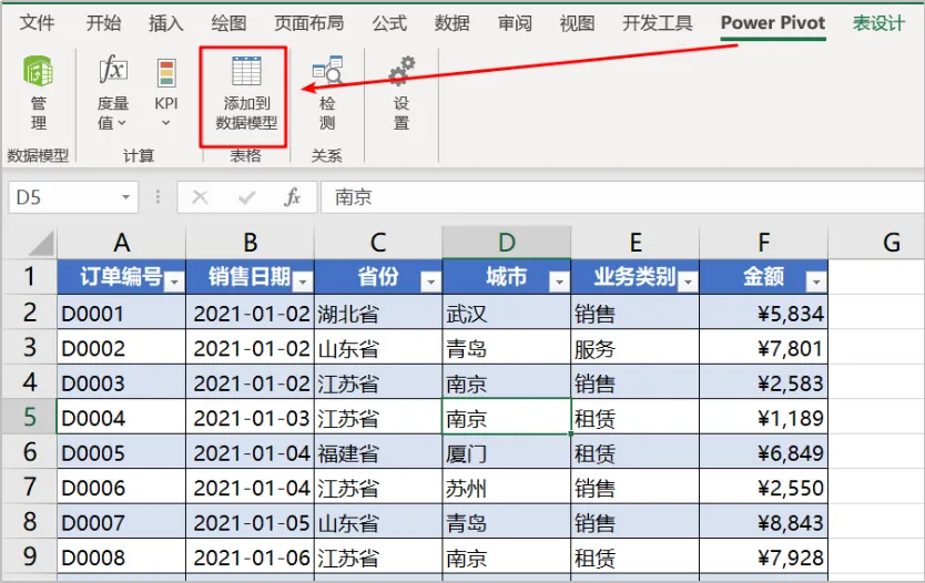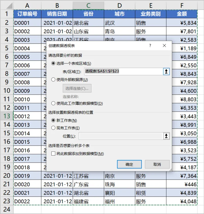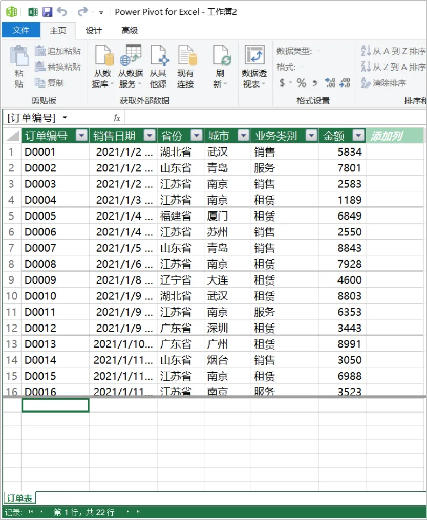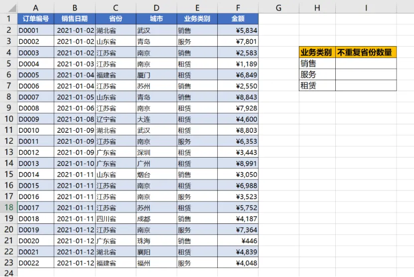 这是公司的部分销售订单表,主要涉及省份、城市、业务类别和金额。