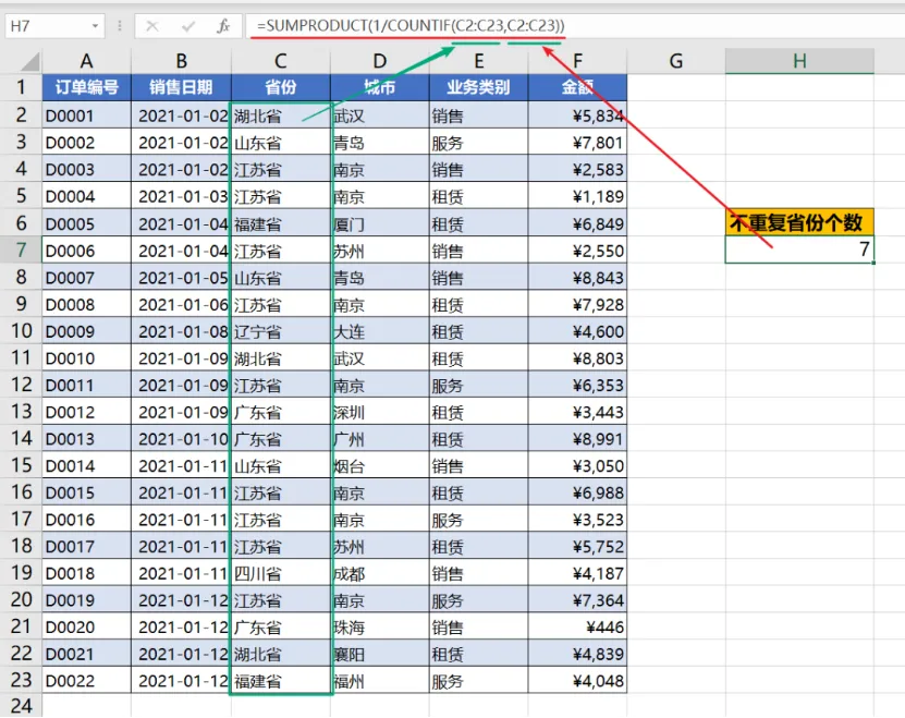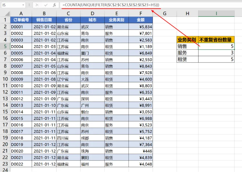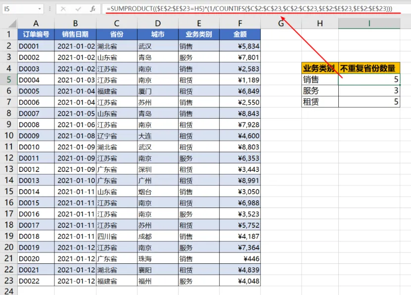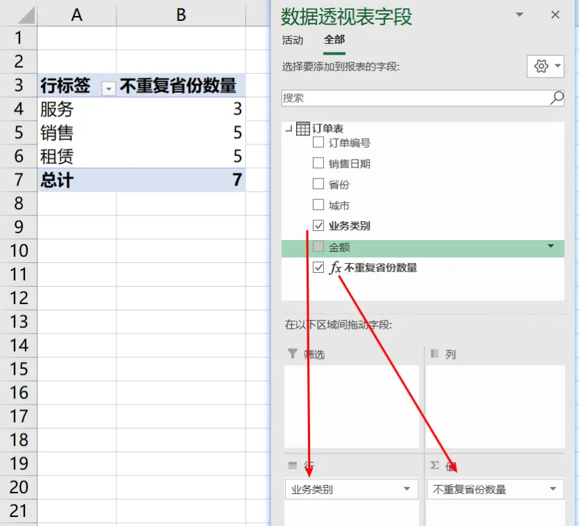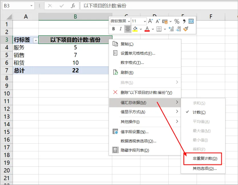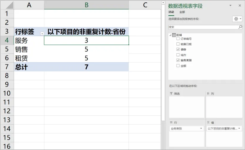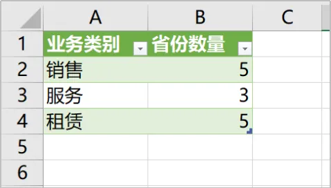 统计公司三大业务覆盖的省份数量,这是典型的非重复计数的案例。