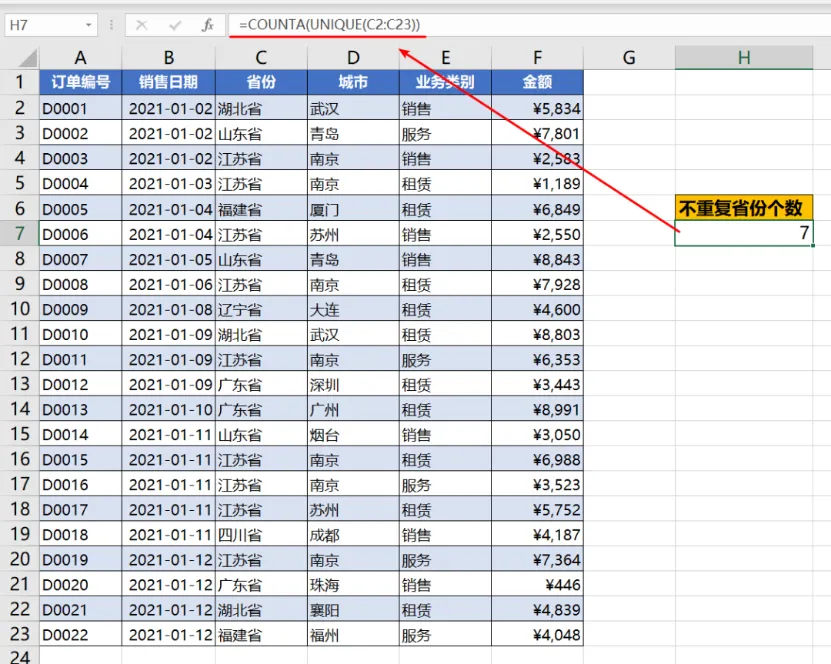 H7=COUNTA(UNIQUE(C2:C23))