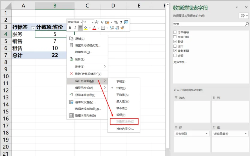 这样,在“值汇总依据”中可以用“非重复计数”功能了。