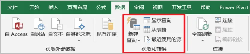 在Excel中与Power Query有关的功能都集中在功能区“数据”选项卡中,不同版本功能菜单名称略有差别。