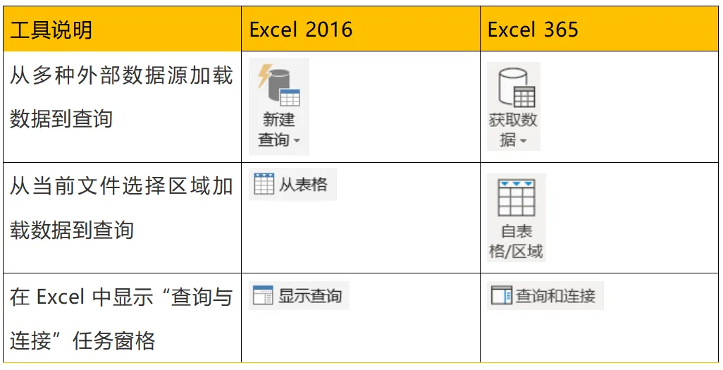 下图显示的是Office 2016和Office 365版本中Excel的Power Query功能。