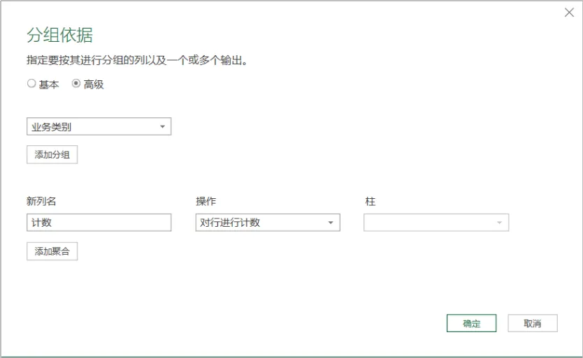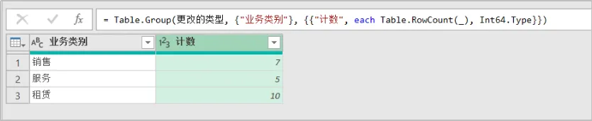 = Table.Group(更改的类型, {"业务类别"}, {{"计数", each Table.RowCount(_), Int64.Type}})