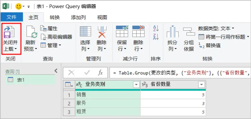 = Table.Group(更改的类型, {"业务类别"}, {{"省份数量", each List.Count(List.Distinct(_[省份])), Int64.Type}})